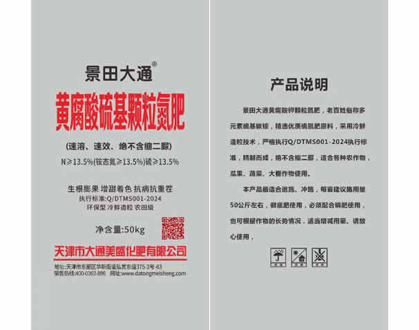天津市大通美盛化肥有限公司是集科研、生产、销售与新型肥料推广于一体的大型复合肥企业。坐落在天津市,占地500亩。职工600多人,其中工程技术人员80名。公司现复混合肥料设计生产能力180万吨,其中稳定性长效缓释免追肥100万吨。公司始终坚持“客户为上,诚信为本”的宗旨。经过近多年的努力,公司在肥料的研究和应用中,取得了突破性的进展,肥料应用和生产技术水平全部符合标准,使作物一次底施一季免追肥成为现实,为农业肥料开辟了一个新的领域,引领了缓释控释肥料的潮流。